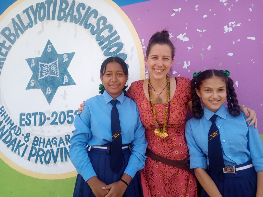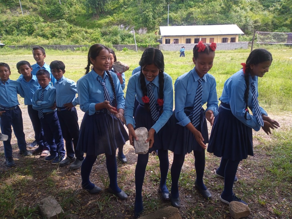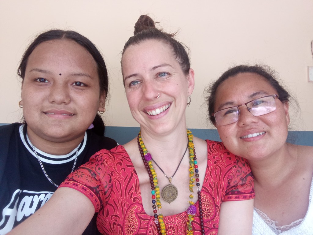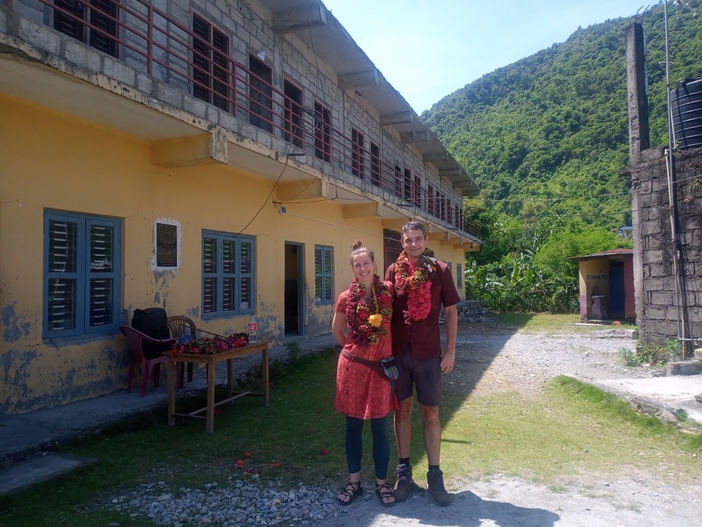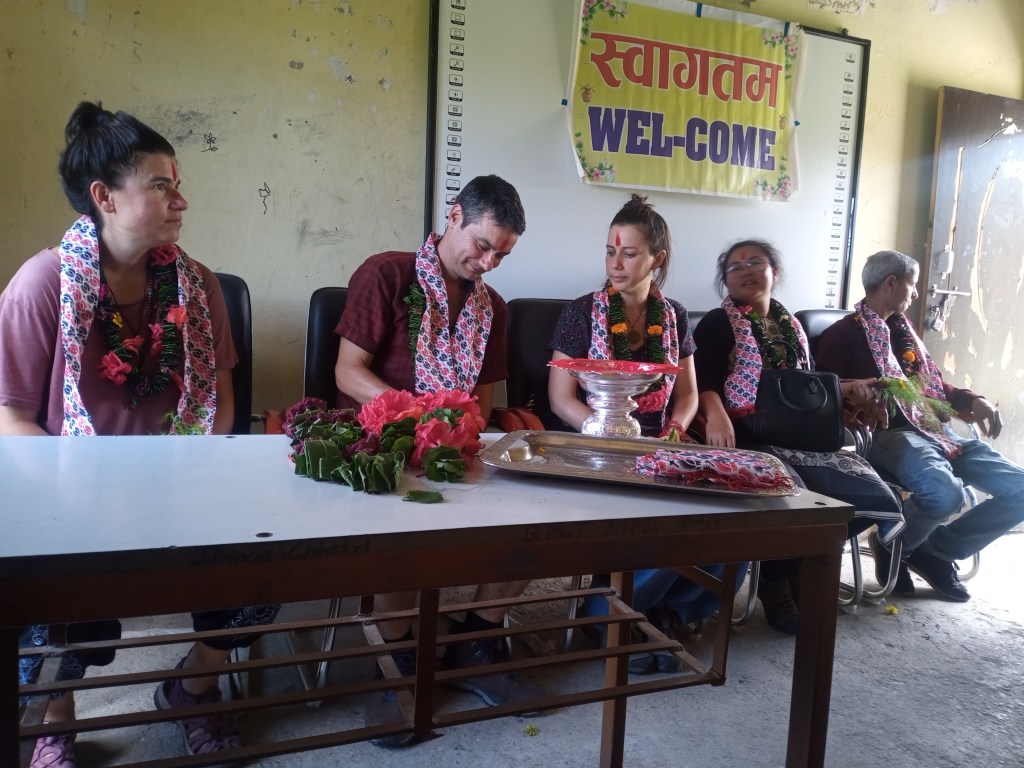 Llegamos a la escuela donde nos reciben al estilo nepalí. Nos llenan las manos de flores multicolor y nos ponen collares, también de flores, hechos a mano por las familias de las alumnas y alumnos. Es un día caluroso, por lo que nos conducen a una de las humildes aulas, donde nos sentamos junto a todo el claustro docente y el equipo directivo. Tras unas palabras de mutuo agradecimiento y reconocimiento nos ponemos manos a la obra. Formamos un gran equipo durante dos días: miembros del equipo docente y de la comunidad educativa de Magloyadaya, las dos clases del curso 10 de la escuela (jóvenes de entre 15 y 16 años), el equipo de Hamro Pratisthan y nosotras.