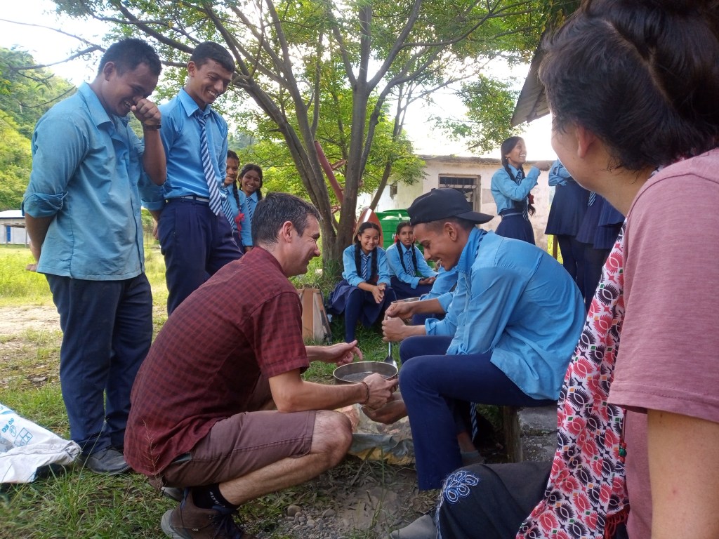 Prácticamente desde el momento que llegamos nos acompaña Nujra*, un buen amigo desde hace años. Cuando le conocimos tenía 16 años y quería ser maestro. Con el apoyo de TAI y a través de las becas educativas, pudo continuar con sus estudios. Durante dos cursos fue tutor de las sesiones de After Class y acompañó a varias personas voluntarias en su paso por la escuela de Bhagar. Tiene múltiples talentos, entre ellos, hacer de guía y bailar música tradicional nepalí con un toque hip-hopero. Terminó sus estudios justo antes de la pandemia, cuando vivía y trabajaba en Pokhara. Con el confinamiento, perdió el trabajo y volvió a Bhagar, su pueblo. Muchos jóvenes en Nepal hicieron el mismo camino de vuelta a casa, con la esperanza de que la agricultura y el aire libre les pudiese proveer más oportunidades que la ciudad. Así es como Nujra emprendió con una pequeña granja de pollos. Éstas fueron las últimas noticias que tuvimos de él, y cuando nos volvimos a encontrar imaginábamos una situación muy diferente a la que nos encontramos.